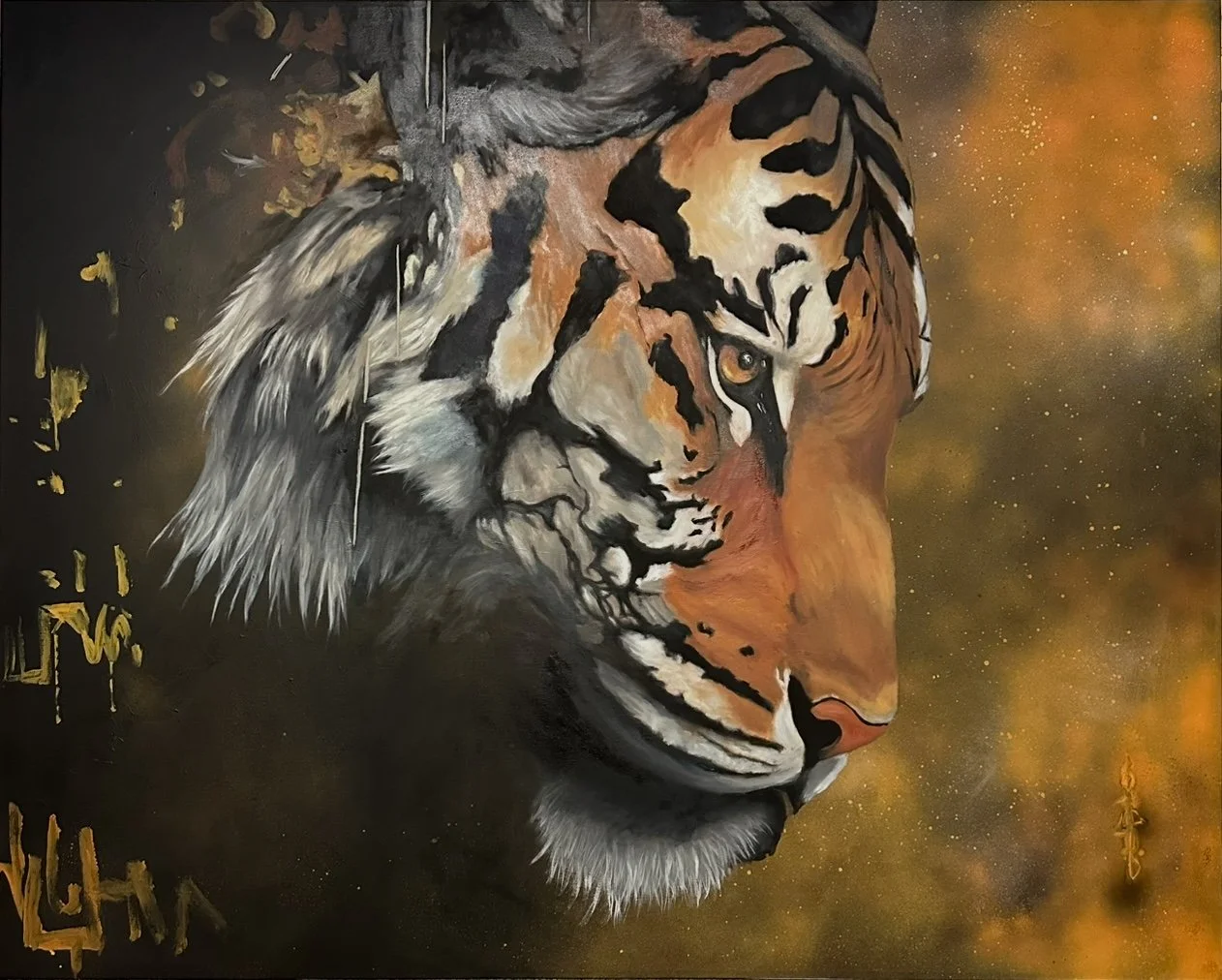 Fant fram det største lerretet som jeg hadde fra ideen om å male et bilde og ha over sofaen hjemme i stua (120*150cm). Litt usikker på motivet, men en tiger er jo alltid et pent skue, så da ble det det. Satte så i gang med sprayboksene og gled rett ned i 6årsalderen før det til slutt ble noe brukbart. Skisset opp med akryl og så oljemaling. Etter noen diskusjoner med meg selv angående detaljer, endte jeg opp med noen krusseduller på siden for å bryte opp bildet litt. Bestandig like spennende å se om det blir i nærheten av ideen jeg setter meg på forhånd.
